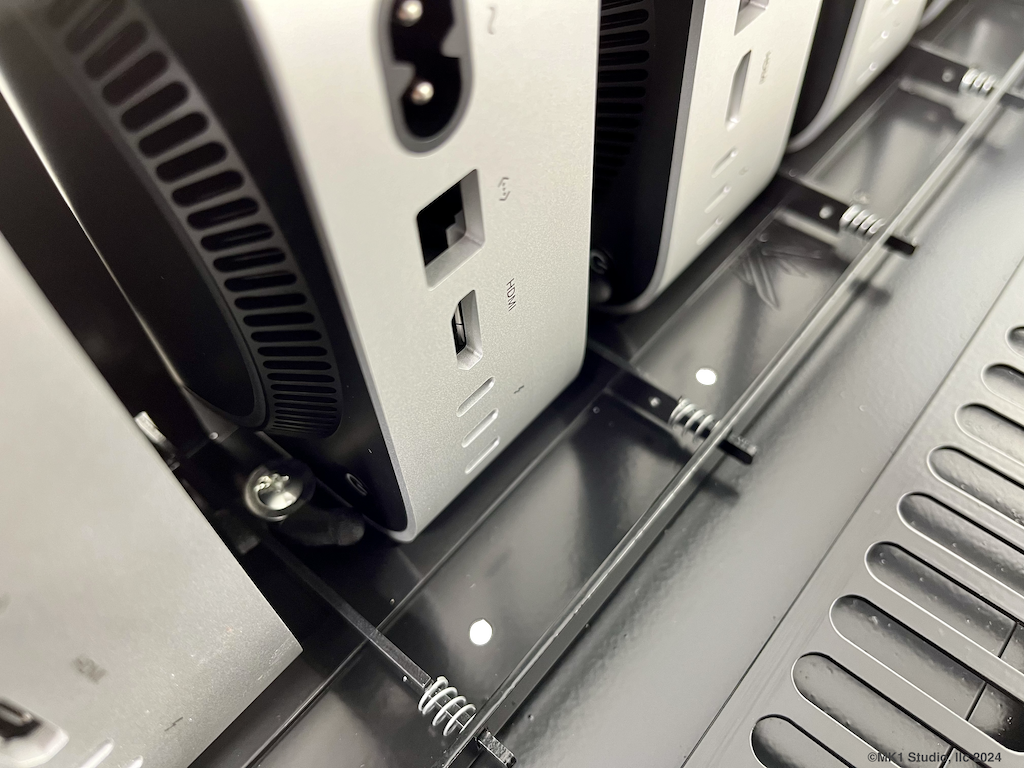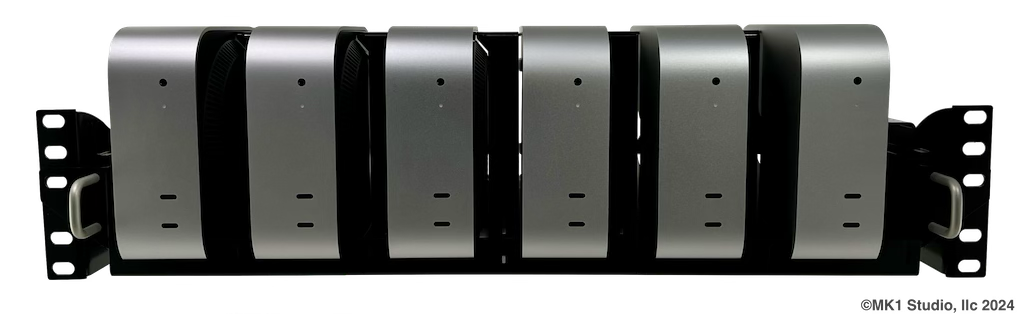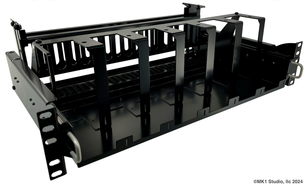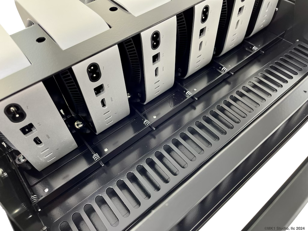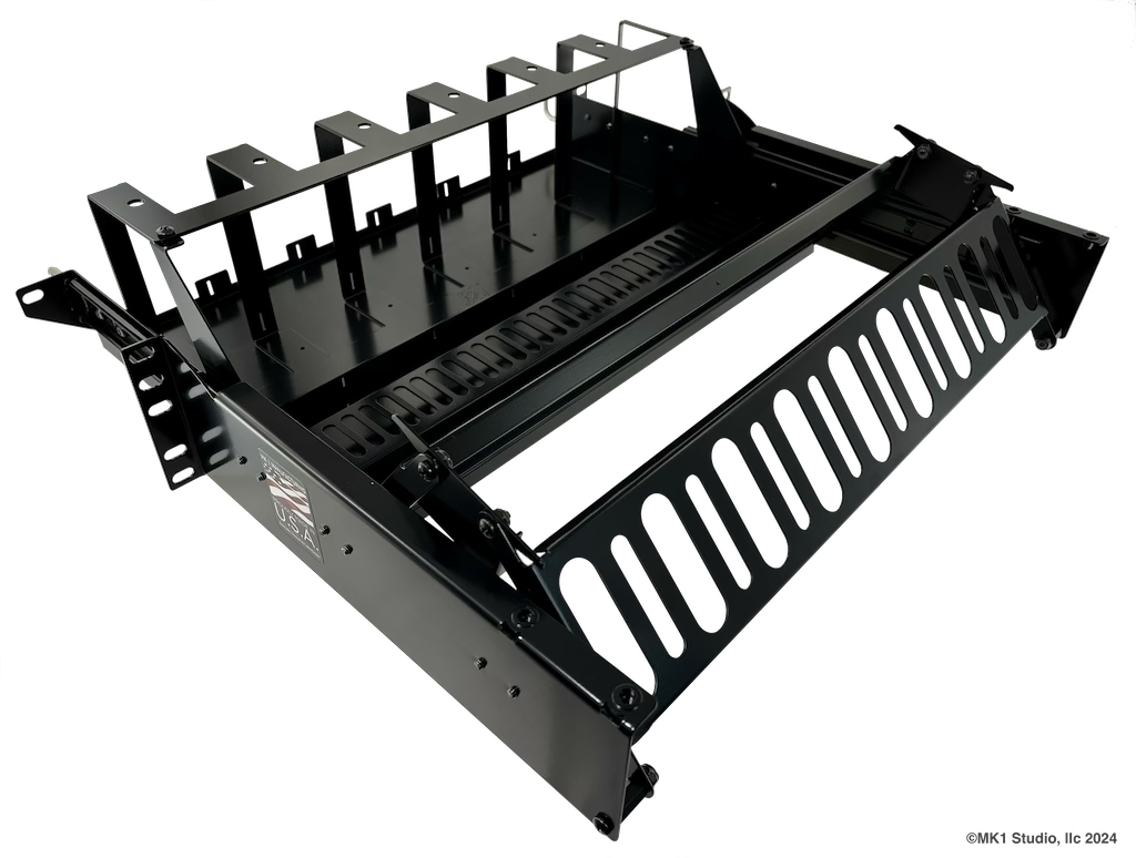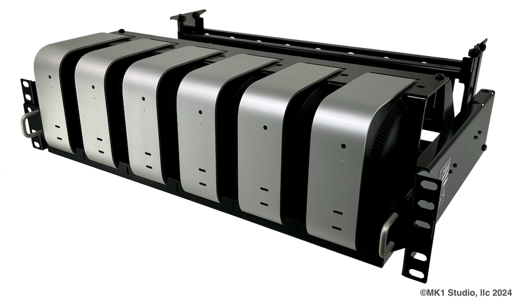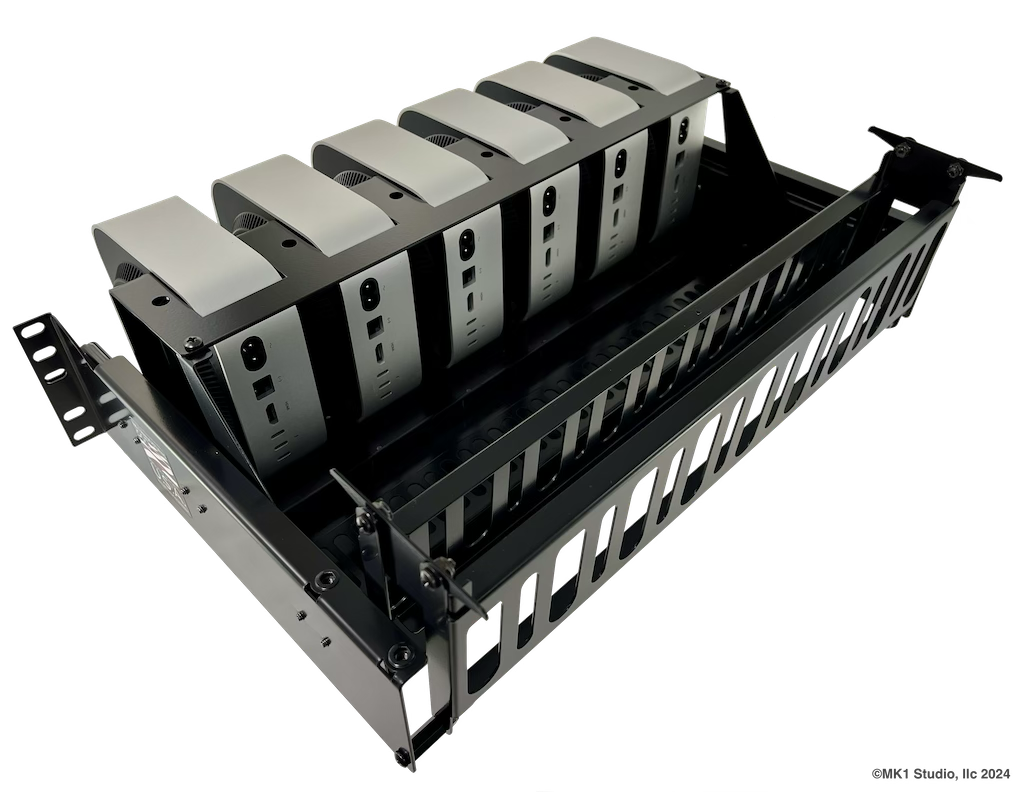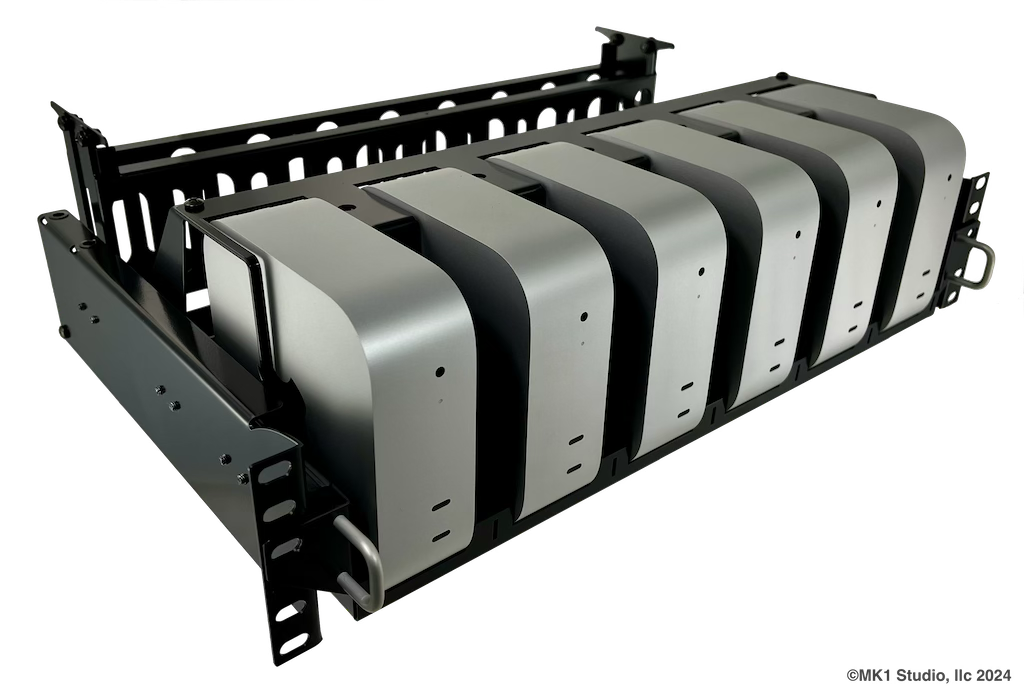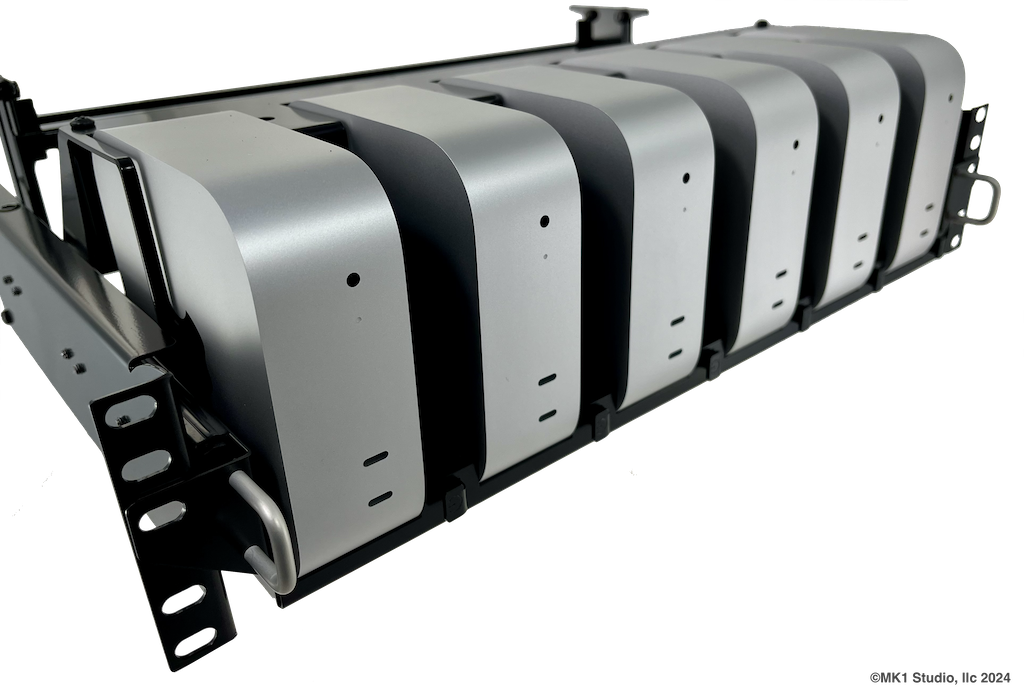 Rack mount shelf for Apple M4 Mac Mini computer. Full ball bearing slide with cable management for easy access to the full computer. The spacer doubles as a baffle by splitting the cool air intake and hot air exhaust for optimal cooling and air flow. The optional power button toggles are spring loaded mechanisms for each bay, giving access from the front of the rack.
